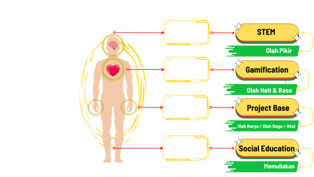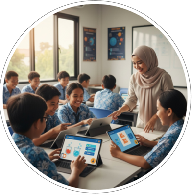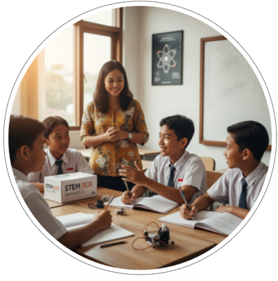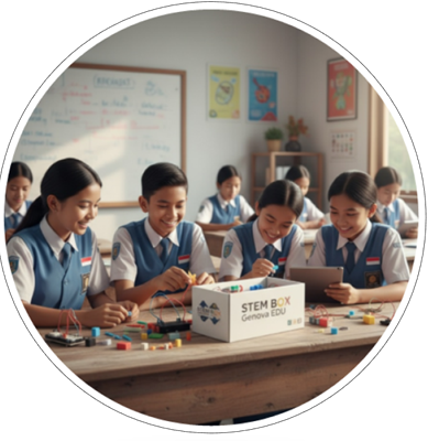 Ekosistem pembelajaran STEM yang menggabungkan digital learning interaktif GAMIFIKASI dan eksperimen nyata melalui GENOVA EDU BOX, membentuk pengalaman belajar yang menyenangkan, praktikal, dan relevan dengan dunia nyata.